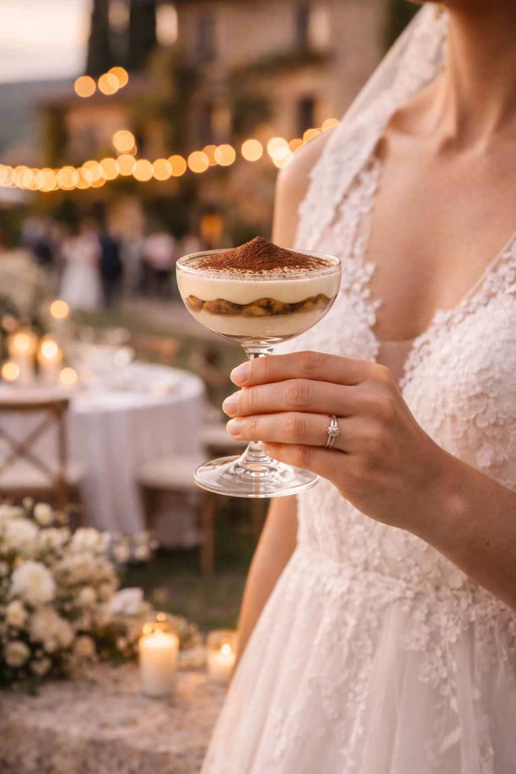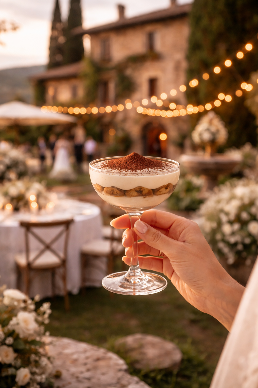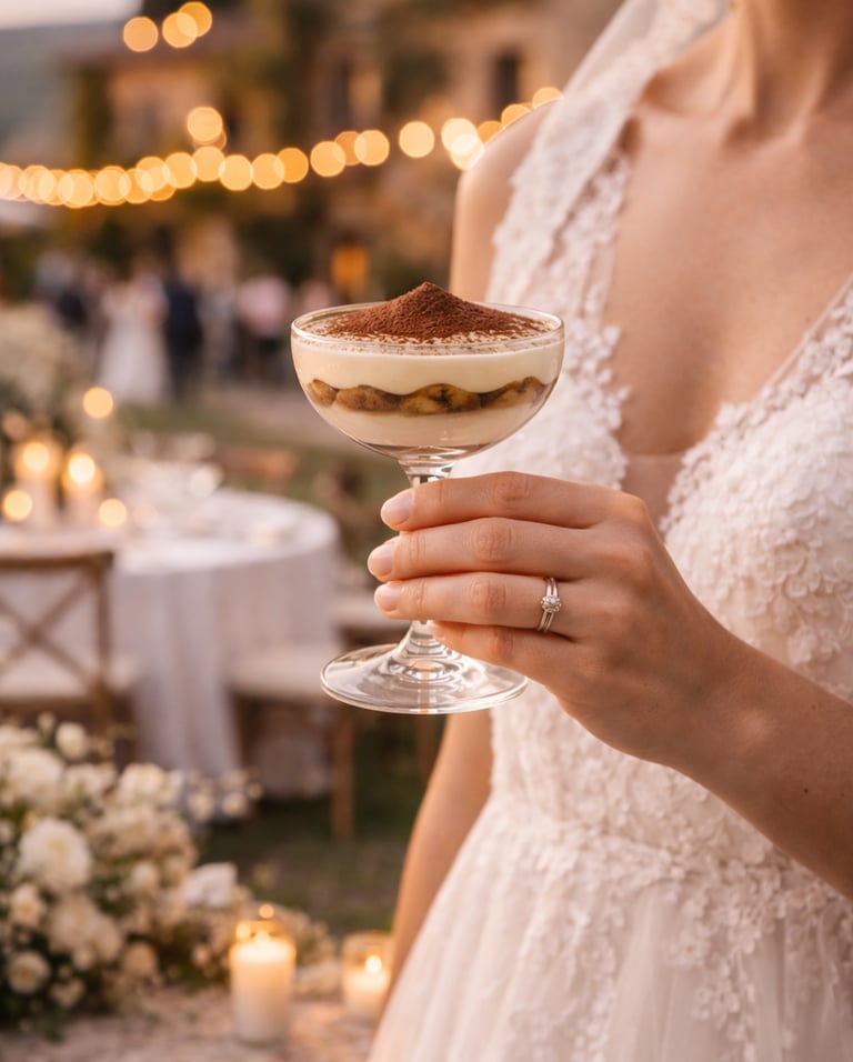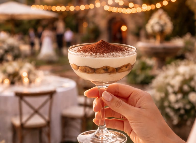 Tiramisu taurių piramidė – tai subtili prabanga, kuri akimirksniu sukuria itališką dolce vita pojūtį. Skaidriose šampano taurėse atsiskleidžiantys švelnaus kremo ir kavos sluoksniai tampa ne tik desertu, bet ir elegantišku šventės akcentu. Tai moderni, rafinuota alternatyva tortui, kuri vestuvėms suteikia išskirtinumo, estetikos ir tikro Italijos skonio jausmą.