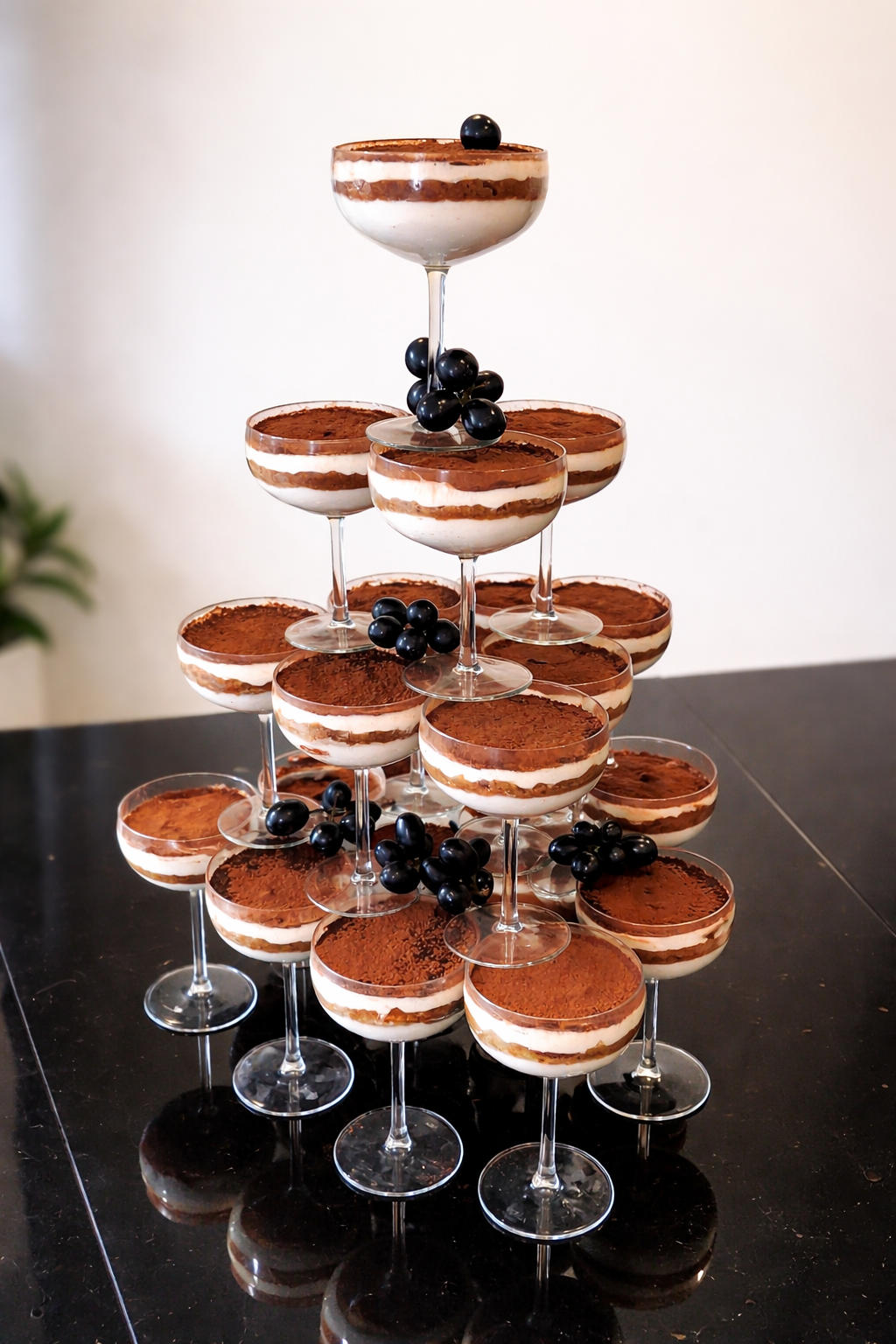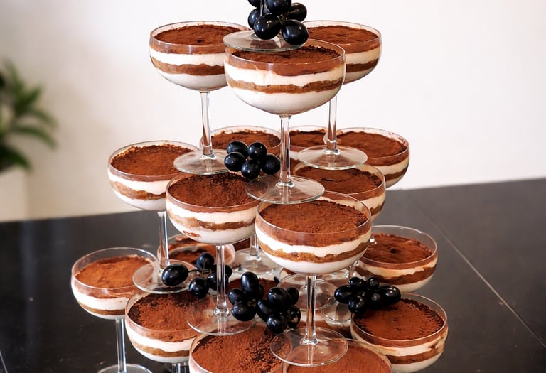 Tiramisu piramidės ir taurės vestuvių akimirkose