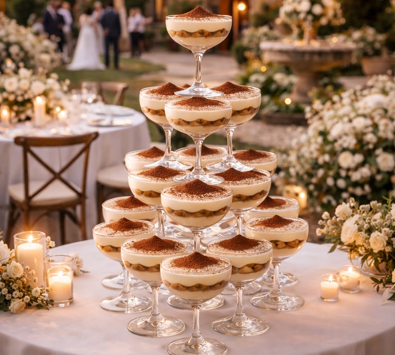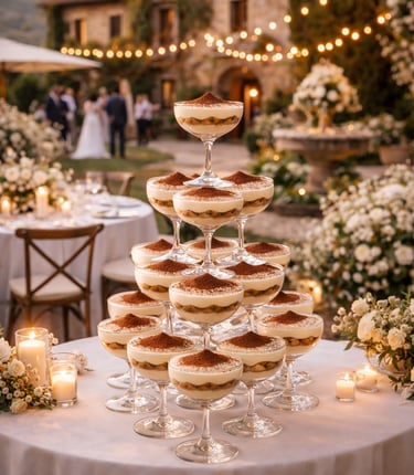 Mes kuriame ne tiesiog desertą, o estetinę patirtį. Mūsų tiramisu šampano taurėse išsiskiria aukščiausios kokybės ingredientais – švelniu maskarponės kremu, tikru espresso, kruopščiai atrinktais sausainiais ir subtiliu kakavos akcentu – bei nepriekaištinga, vestuvėms pritaikyta kompozicija. Elegantiška taurių piramidė tampa šventės akcentu, kuris pakeičia tradicinį tortą ir palieka įspūdį svečiams.